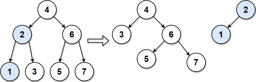 Additionally, most of the structure of the original tree should remain. Formally, for any child c with parent p in the original tree, if they are both in the same subtree after the split, then node c should still have the parent p.