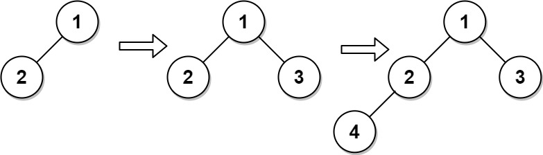 CBTInserter(TreeNode root)Initializes the data structure with therootof the complete binary tree.int insert(int v)Inserts aTreeNodeinto the tree with valueNode.val == valso that the tree remains complete, and returns the value of the parent of the insertedTreeNode.TreeNode get_root()Returns the root node of the tree.