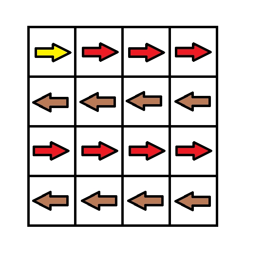 The path to (3, 3) is as follows. (0, 0) --> (0, 1) --> (0, 2) --> (0, 3) change the arrow to down with cost = 1 --> (1, 3) --> (1, 2) --> (1, 1) --> (1, 0) change the arrow to down with cost = 1 --> (2, 0) --> (2, 1) --> (2, 2) --> (2, 3) change the arrow to down with cost = 1 --> (3, 3)