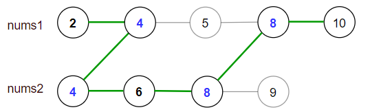**Input:** nums1 = [2,4,5,8,10], nums2 = [4,6,8,9]