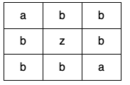**Input:** grid = [["a","b","b"],["b","z","b"],["b","b","a"]]