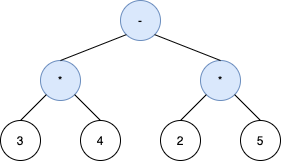 A binary expression tree is a kind of binary tree used to represent arithmetic expressions. Each node of a binary expression tree has either zero or two children. Leaf nodes (nodes with 0 children) correspond to operands (numbers), and internal nodes (nodes with 2 children) correspond to the operators '+' (addition), '-' (subtraction), '*' (multiplication), and '/' (division).