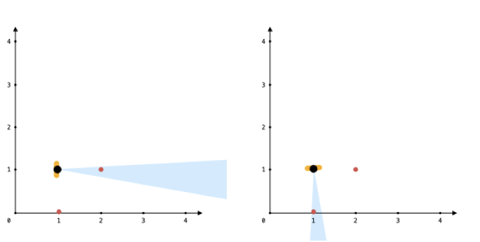 Initially, you are facing directly east from your position. You cannot move from your position, but you can rotate. In other words, posx and posy cannot be changed. Your field of view in degrees is represented by angle, determining how wide you can see from any given view direction. Let d be the amount in degrees that you rotate counterclockwise. Then, your field of view is the inclusive range of angles [d - angle/2, d + angle/2].
