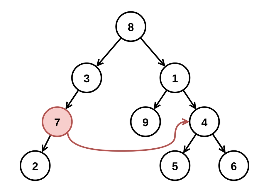 After the binary tree rooted at root is parsed, the TreeNode with value of fromNode will have its right child pointer pointing to the TreeNode with a value of toNode. Then, root is passed to correctBinaryTree.