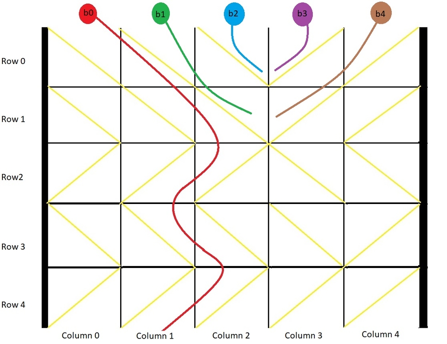 Ball b1 is dropped at column 1 and will get stuck in the box between column 2 and 3 and row 1.