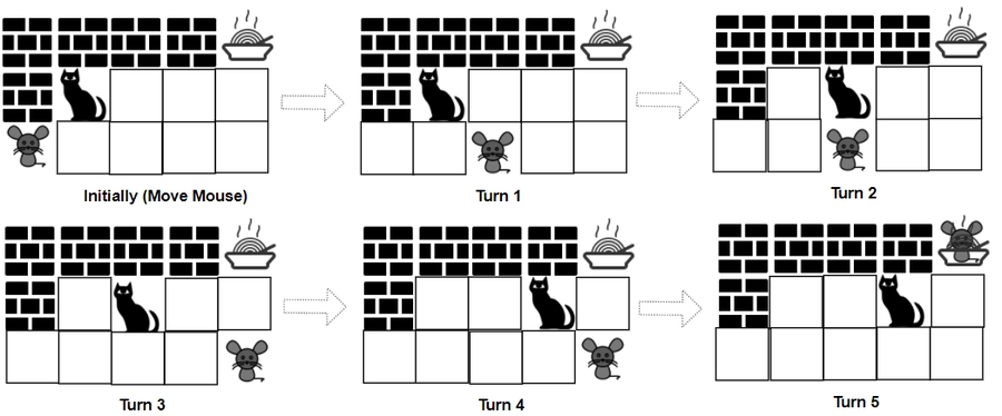 During each turn, Cat and Mouse can jump in one of the four directions (left, right, up, down). They cannot jump over the wall nor outside of the