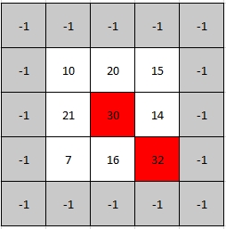 You may assume that the entire matrix is surrounded by an outer perimeter with the value -1 in each cell.