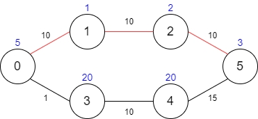 **Input:** maxTime = 25, edges = [[0,1,10],[1,2,10],[2,5,10],[0,3,1],[3,4,10],[4,5,15]], passingFees = [5,1,2,20,20,3]