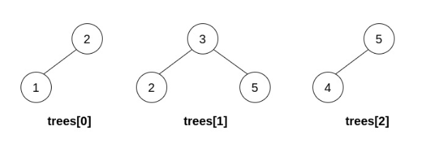 You are given n BST (binary search tree) root nodes for n separate BSTs stored in an array trees (0-indexed). Each BST in trees has at most 3 nodes, and no two roots have the same value. In one operation, you can: