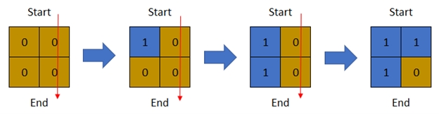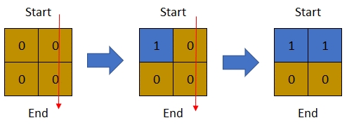 **Input:** row = 2, col = 2, cells = [[1,1],[2,1],[1,2],[2,2]]